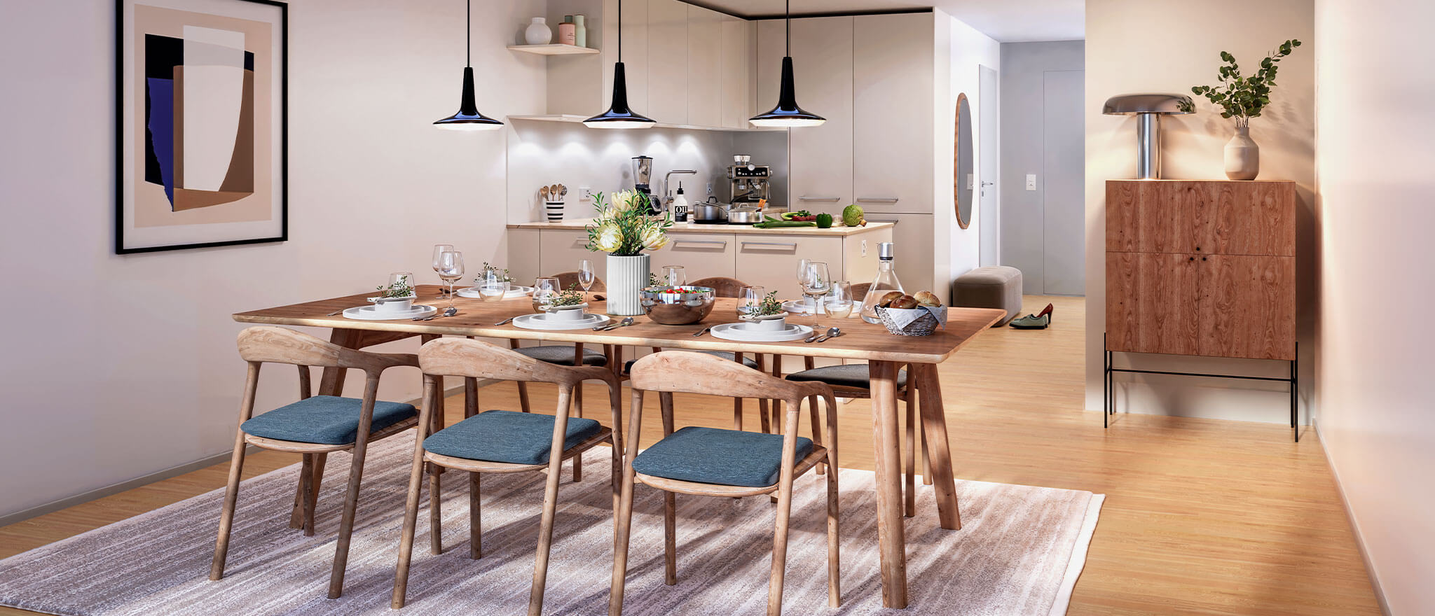 Grosszügige, lichtdurchflutete Räume schaffen eine einladende Atmosphäre, während die durchdachten Grundrisse maximale Flexibilität für individuelle Lebensstile bieten. Feinste Materialien wie Eichen-Langriemenparkett verleihen den Innenräumen eine warme, natürliche Ausstrahlung, während hochwertige Ausstattungselemente stilvolle Akzente setzen.