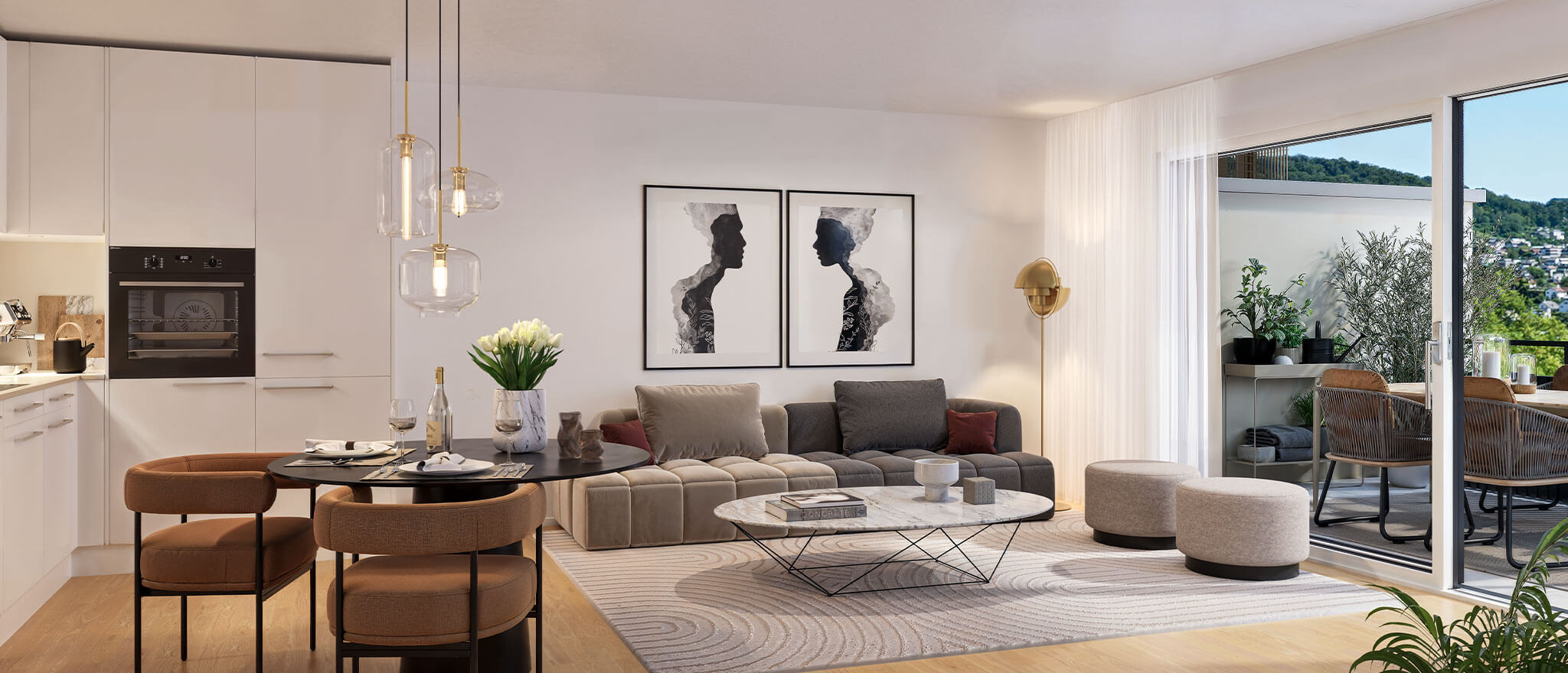 Elektrische Markisen ermöglichen eine komfortable Regulierung des Raumklimas. Die privaten Aussenflächen, sei es mit Weitblick oder zum begrünten Innenhof hin ausgerichtet, laden dazu ein, entspannte Stunden im Freien zu verbringen – ob in geselliger Runde oder als persönlicher Rückzugsort.